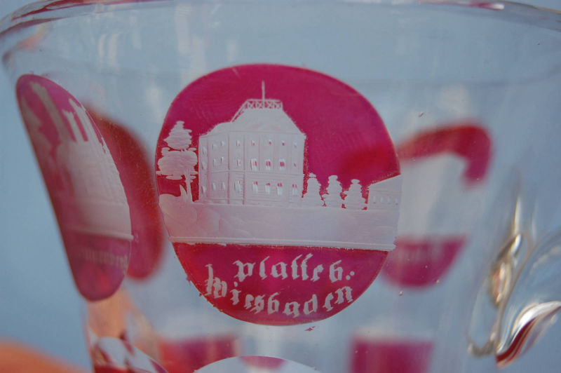 Andenkenbecher Wiesbaden, 19. Jahrhundert, 4 geschliffene Ansichten in rotem Unterfang, Höhe 11 cm