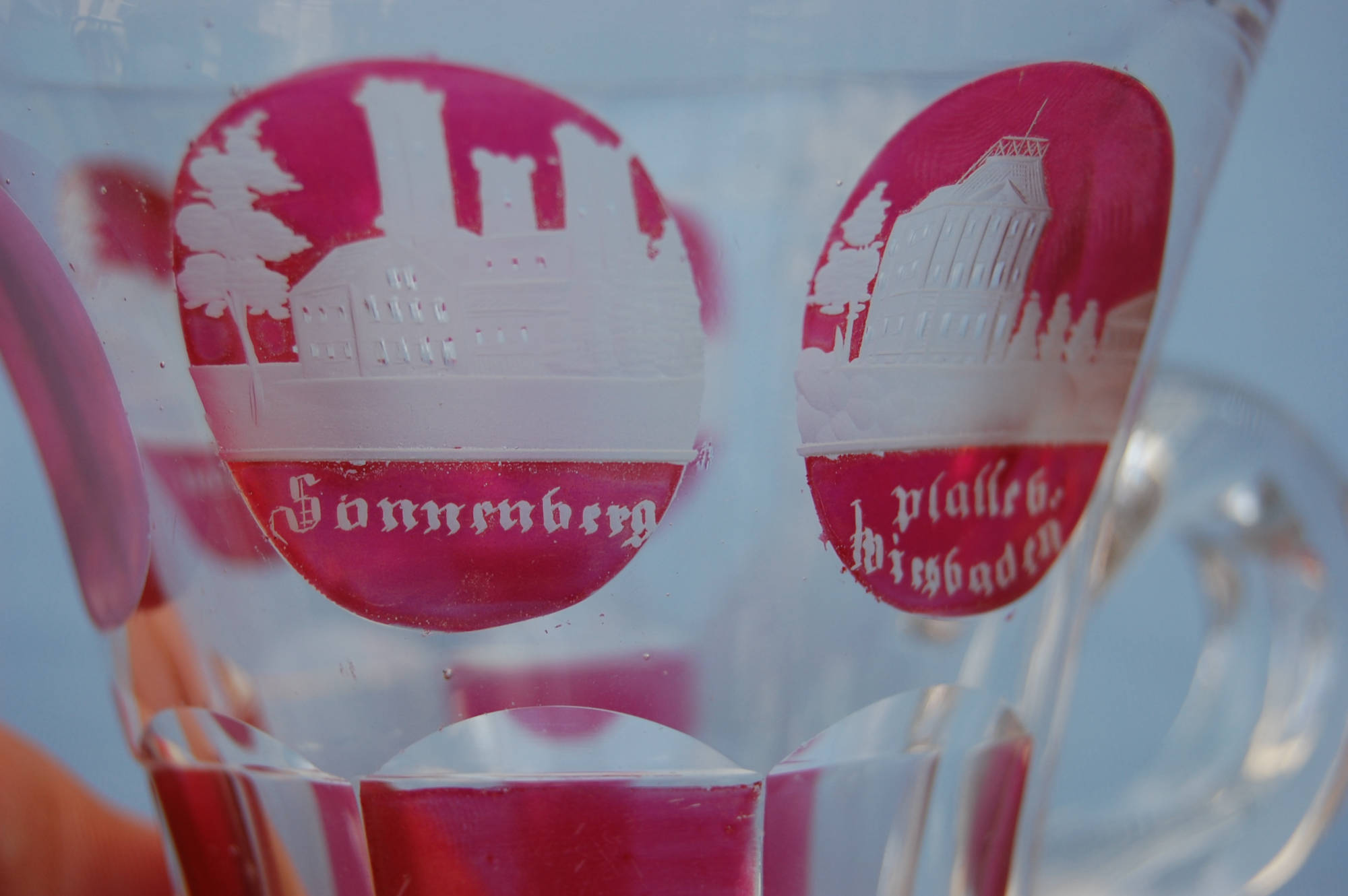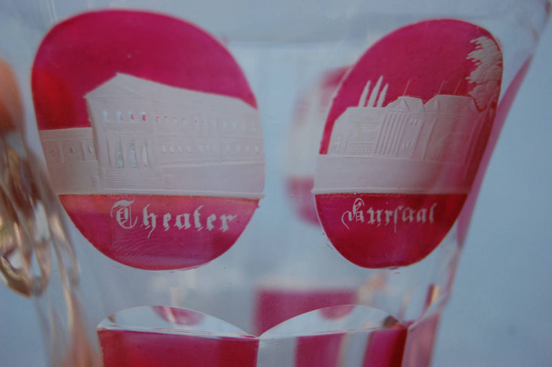 Andenkenbecher Wiesbaden, 19. Jahrhundert, 4 geschliffene Ansichten in rotem Unterfang, Höhe 11 cm