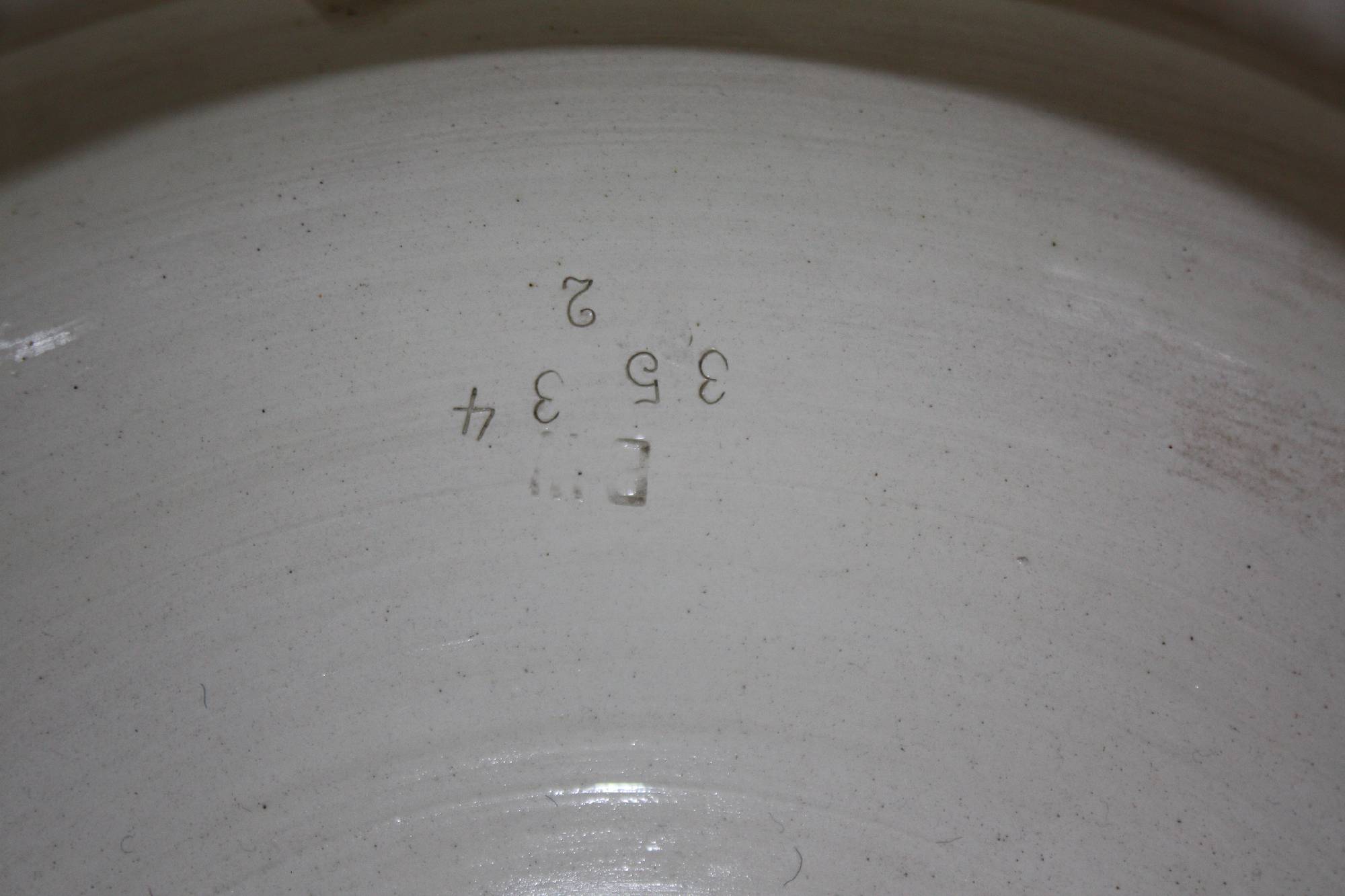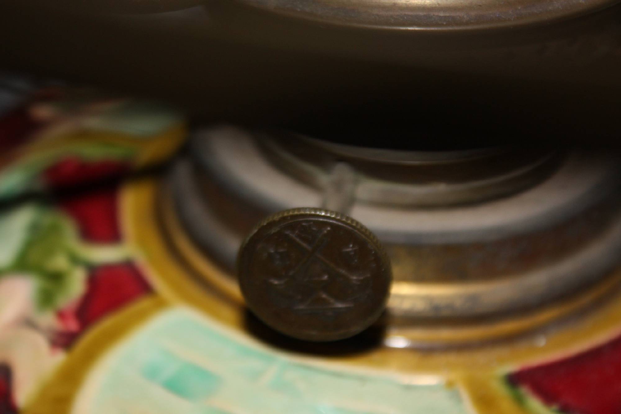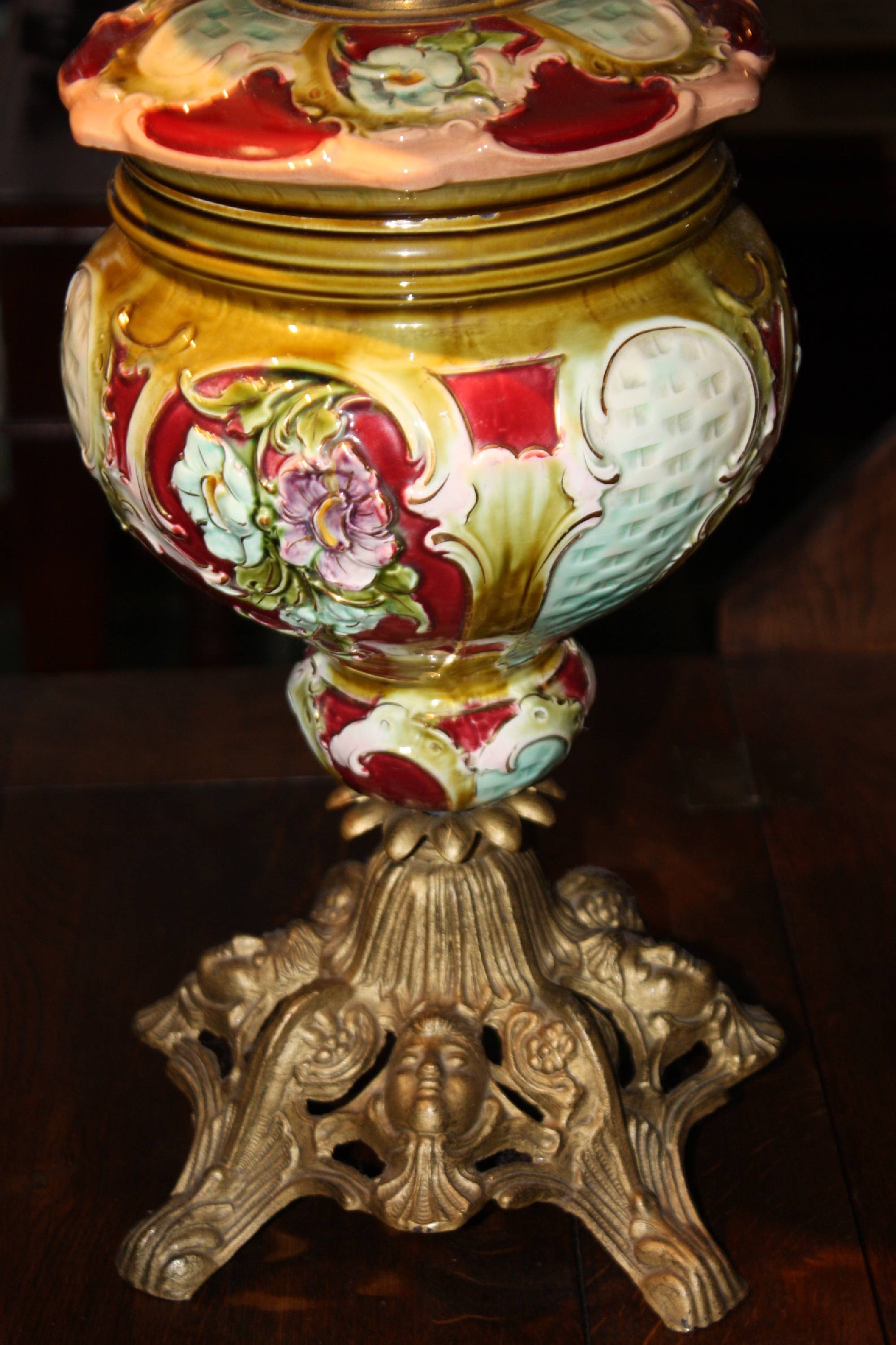 Petroleumlampe, um 1900, signiert "BW", Steingutkorpus, Höhe 68 cm