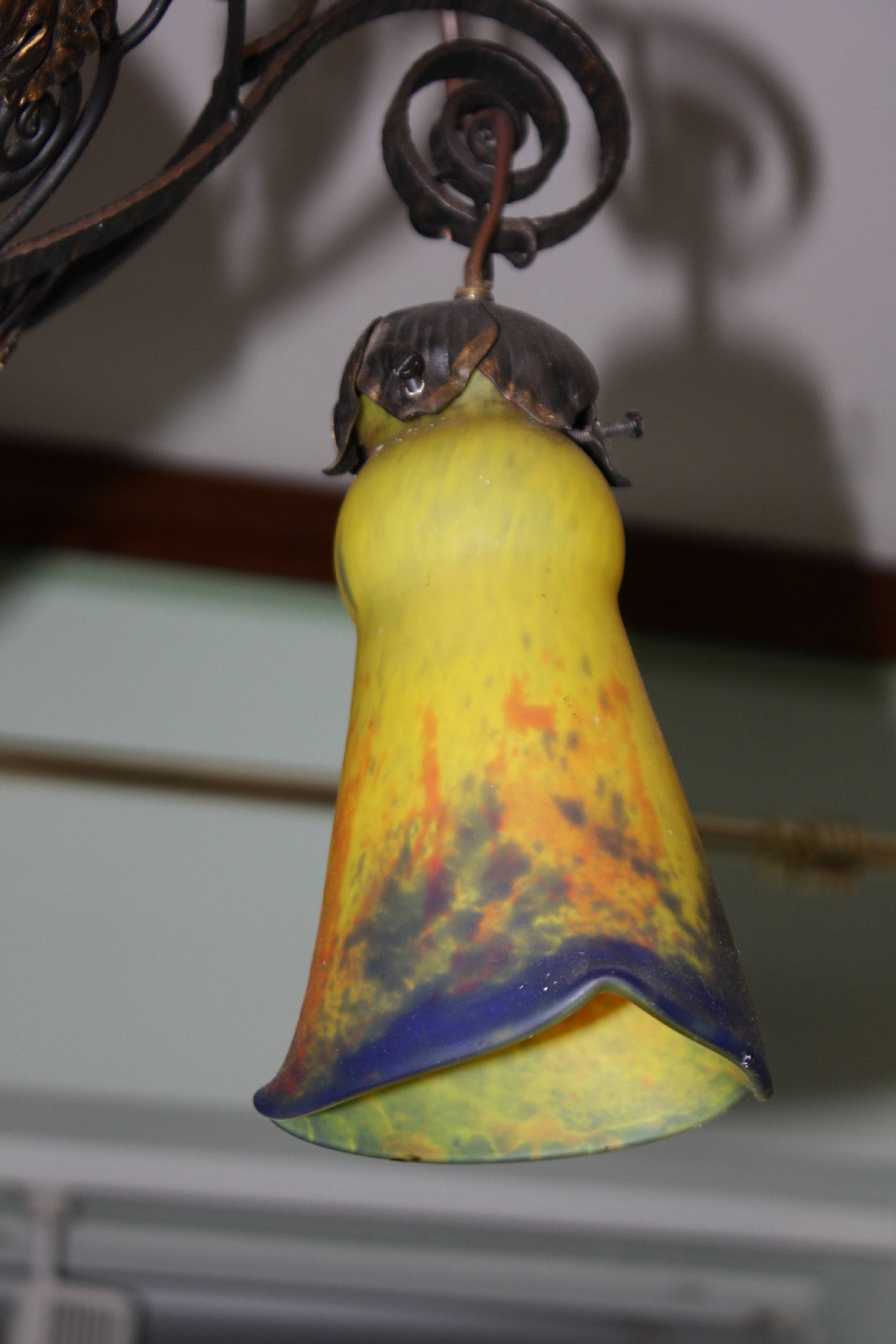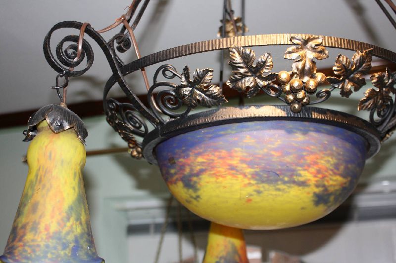 Deckenlampe, Frankreich um 1920, farbloses Glas mit mehrfarbigen Pulvereinschmelzungen, mattierte Oberfläche, dreiarmige, schmiedeeiserne Aufhängung mit reicher Weinranken-Verzierung, drei Lampenschirme, Durchmesser 65 cm, Höhe: 95 cm