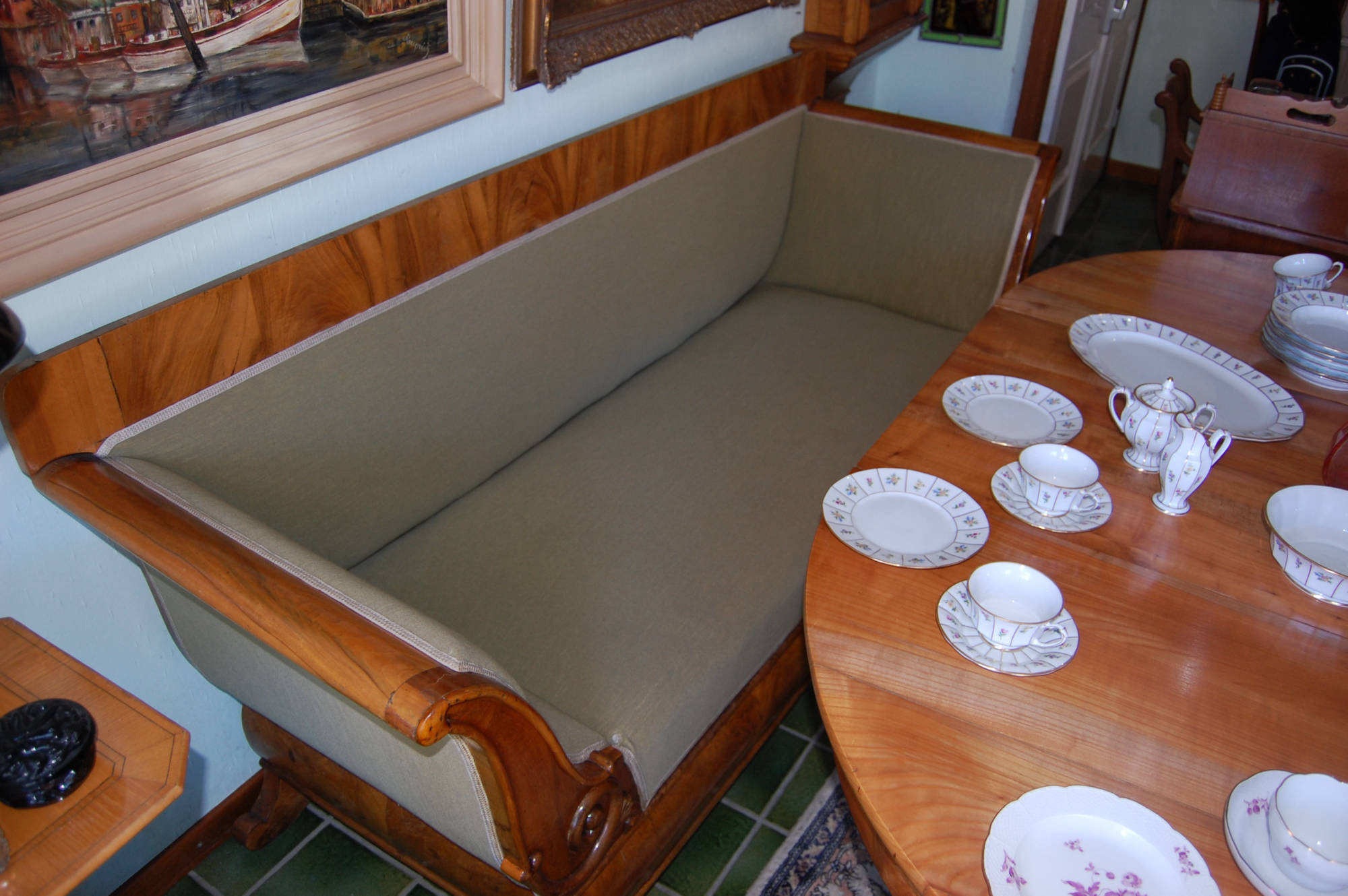 Biedermeier Sofa, um 1840, Kirsche furniert, Höhe 93 cm. Breite 201 cm, Tiefe 62 cm