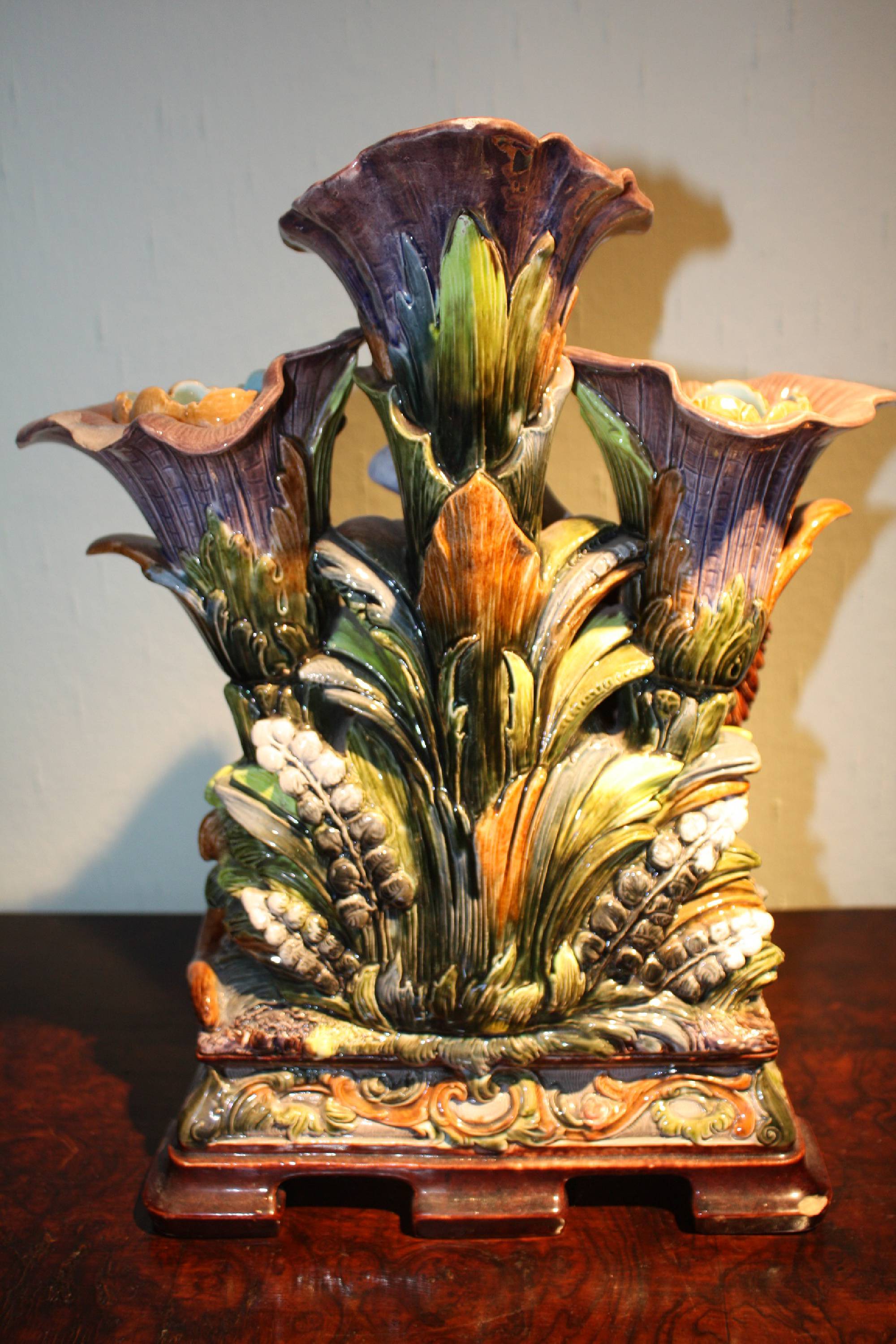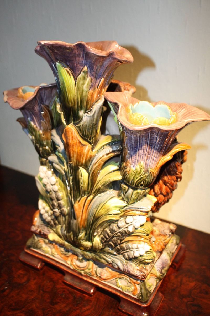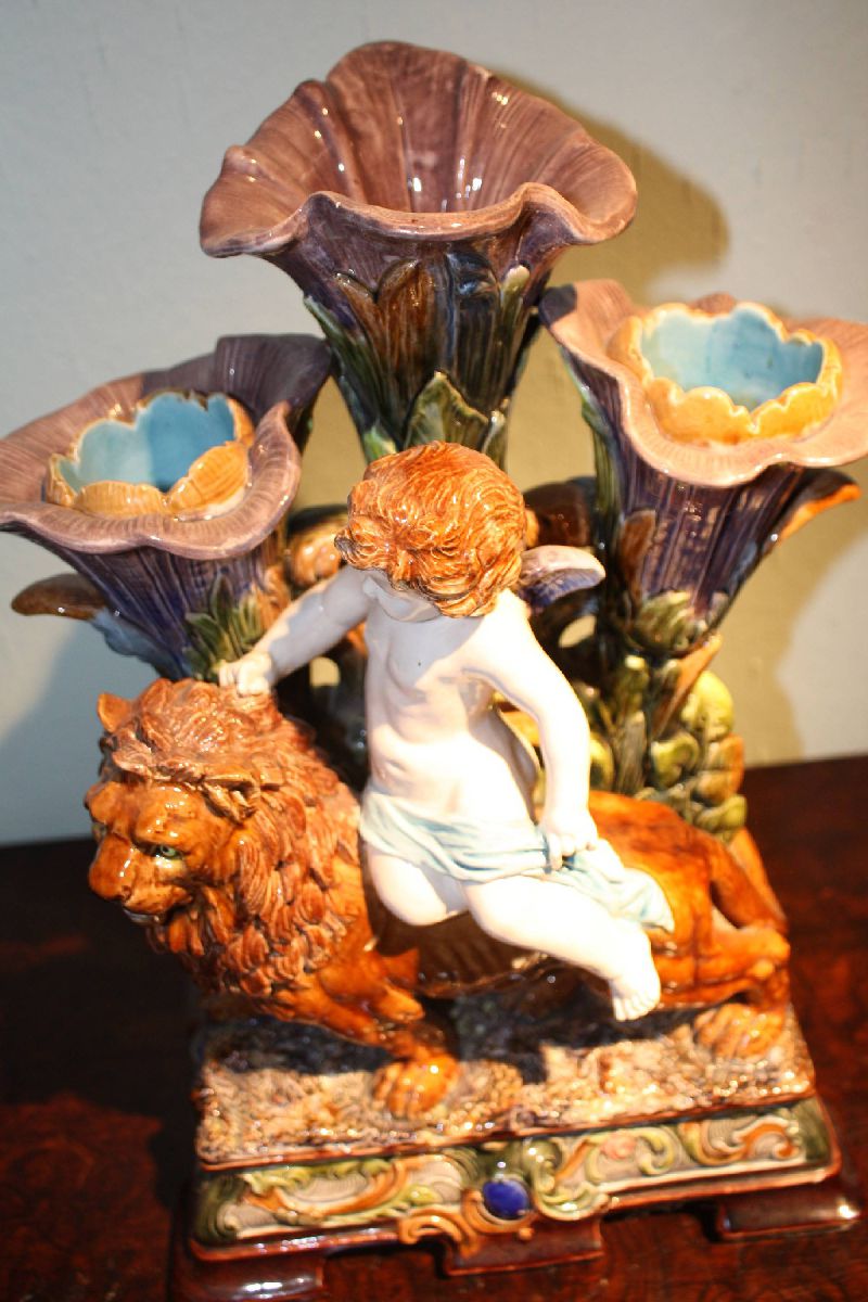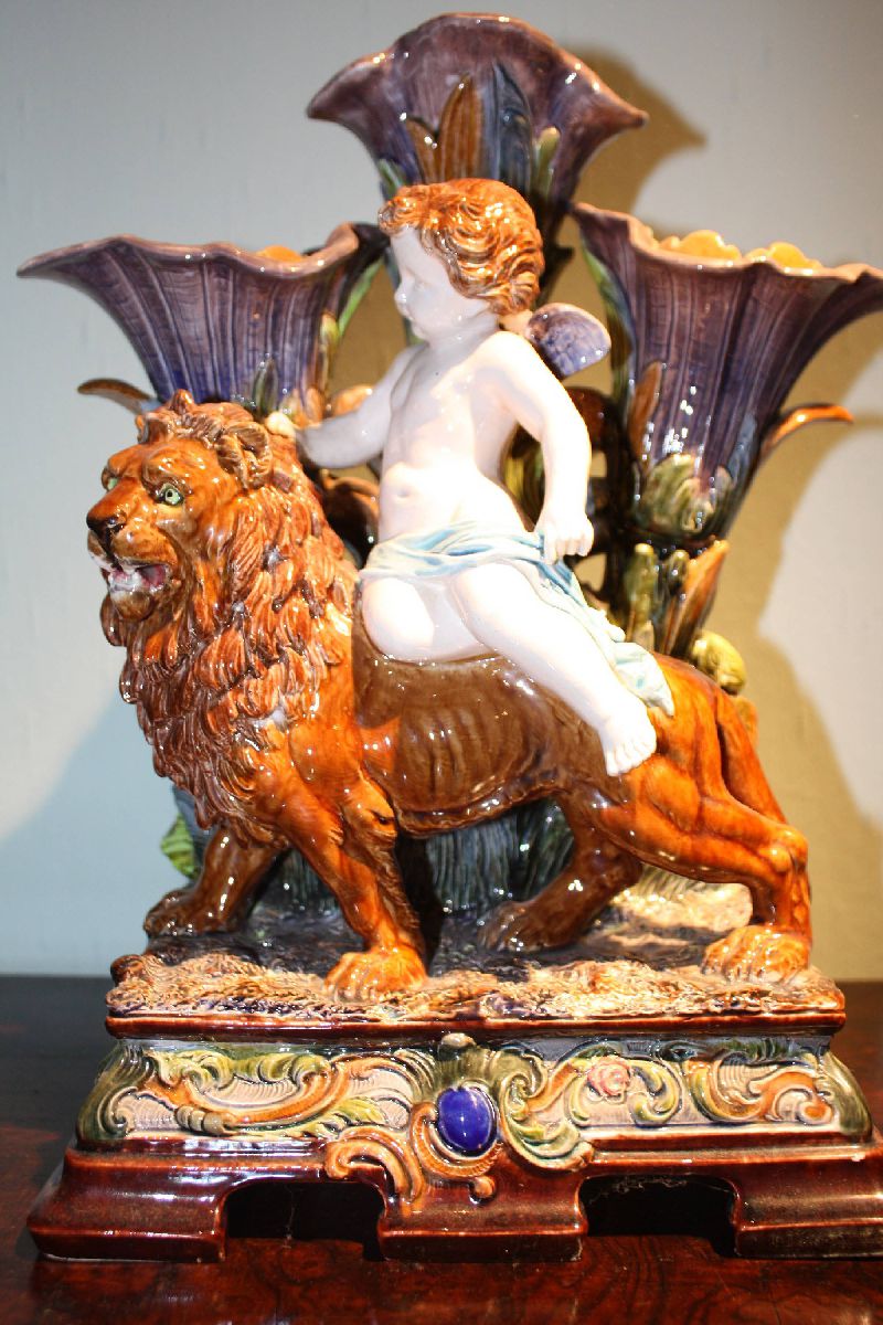 Prunkvolle, große Majolika, Putto auf Löwe reitend. dahinter drei Blütenkelche, die als Vasen dienen, Steingut, um 1890, Wien, signiert, Höhe 36 cm, Länge 28 cm, Breite 20 cm