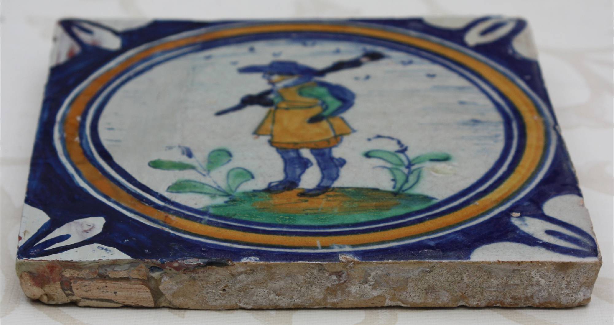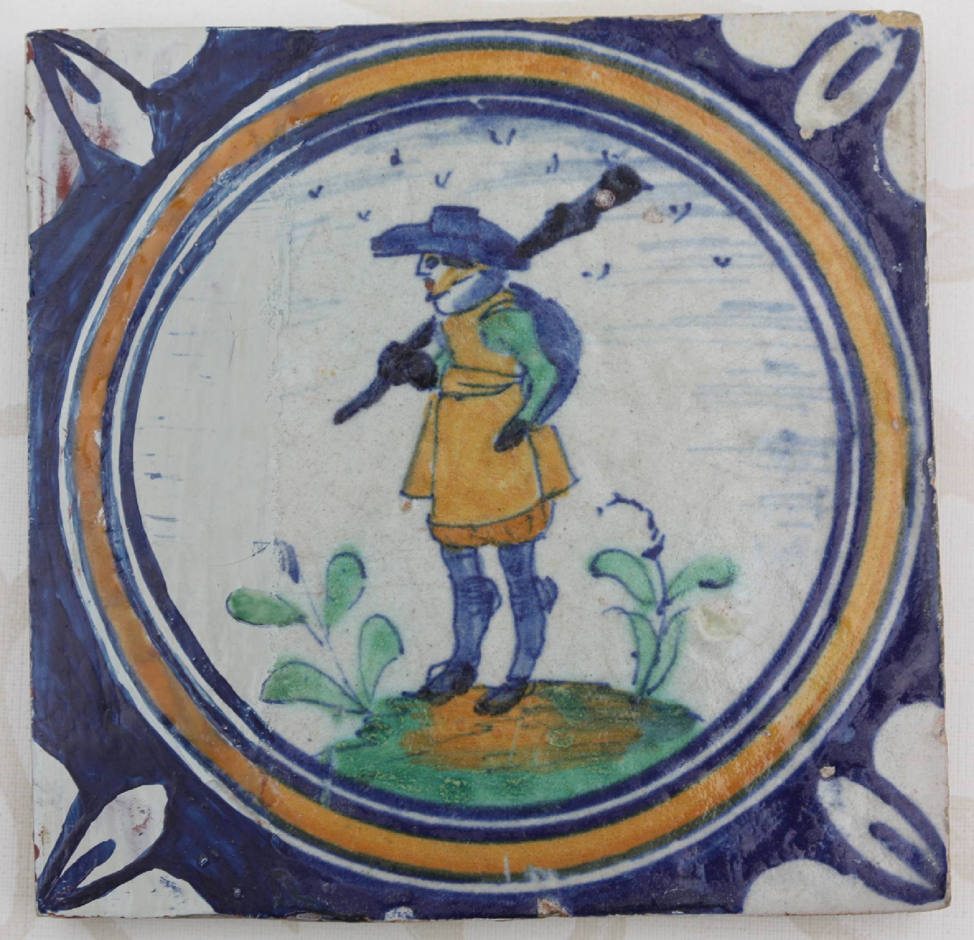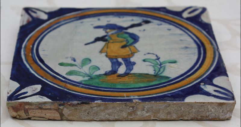 Antike, polychrome Delfter Fliese mit Medaillon, Musketier, um 1625, 13 cm x 13 cm x 1,4 cm
